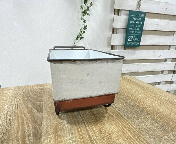今回ご紹介する商品は、ブリキ製のガーデニングポットです。 クラシカルなデザインでツートンカラーがオシャレです。文字もかすれ具合がいい感じ♪